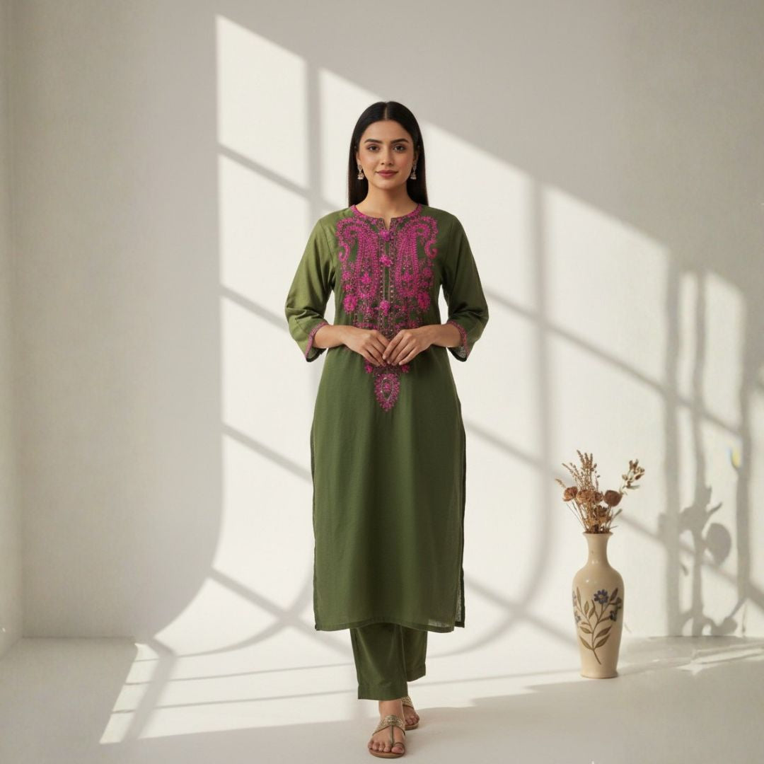 Crafted from an intermix fabric in a vibrant green hue, this outfit is elevated with striking fuchsia embroidery adorning the neckline. Delicate embroidered motifs on the trouser add a refined finishing touch, creating a balanced blend of bold colour and intricate detailing. Designed for a polished yet contemporary look, this ensemble stands out effortlessly for festive and semi-formal wear. Its shirt is long paired with trouser