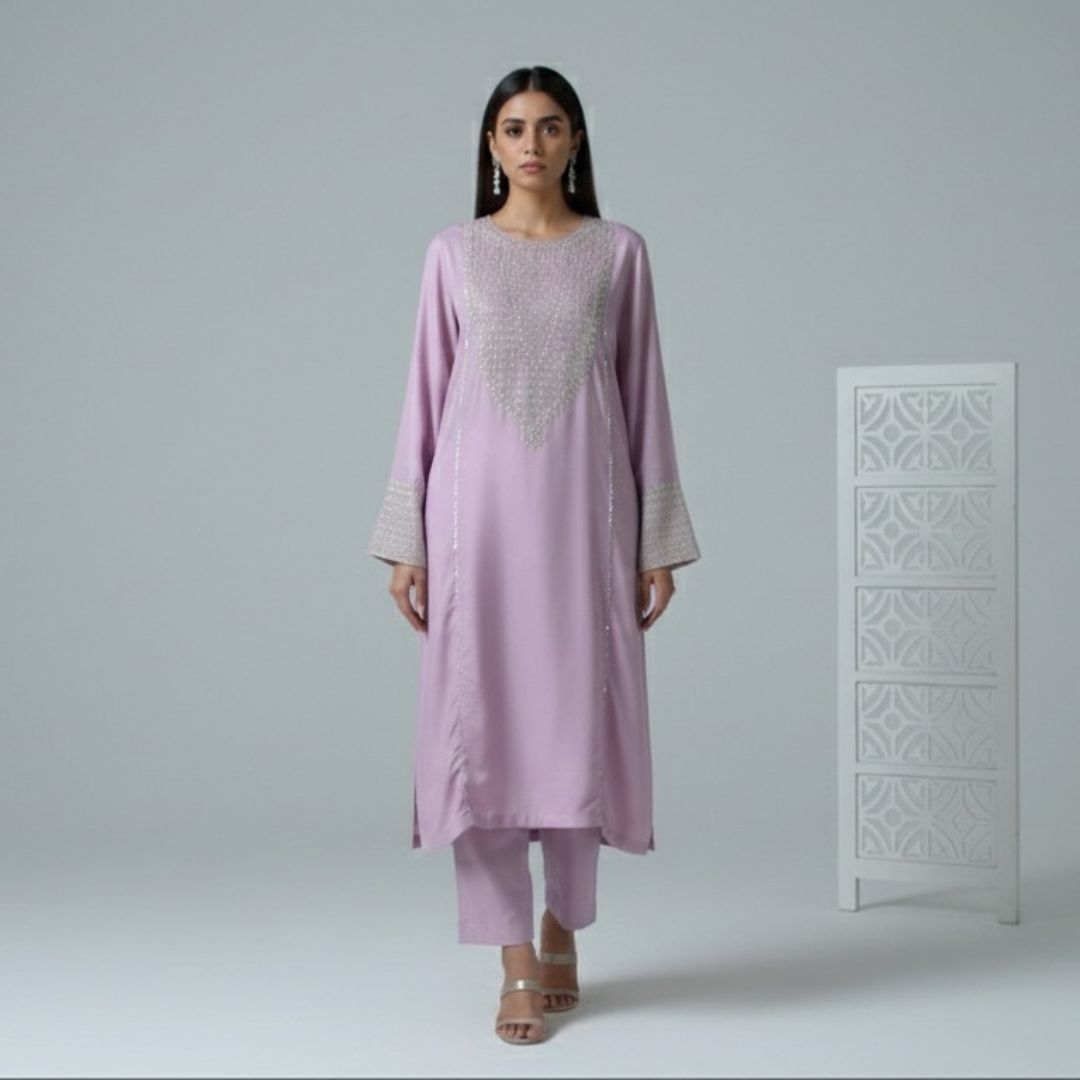 Crafted in a light lilac intermix fabric, accented with intricate tilla embroidery on the neckline and sleeve borders. Ita a long shirt paired with trouser Subtle colour variations may occur due to lighting and display differences.