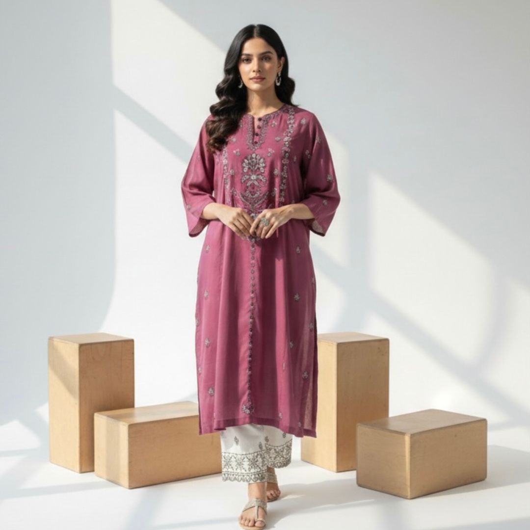 This winter ensemble features a deep pink long shirt adorned with all-over thread embroidery on the front,...